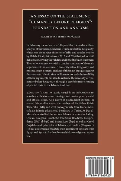 In this essay the author carefully provides the reader with an analysis of the theological claim 'Humanity before Religiosity' which was the subject of a series of talks and articles written by Habib Ali al-Jifri between 2012 and 2014 that led to vivid debates concerning the validity and benefit such statement.¿The author commences with a concise summary of the main arguments of the statement 'Humanity before Religiosity' and proceeds with a careful analysis of the main critiques against the statement. Hamid aims to illustrate not only the invalidity of these arguments but also to reiterate the necessity of 'Humanity before Religiosity' through a careful cursory reading of pivotal texts in the Islamic tradition.