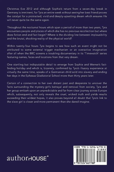 Christmas Eve 2012 and although Sophie’s return from a seven-day break in Germany is imminent, for Tyra an entire week without seeing her best friend proves the catalyst for a protracted, vivid and deeply-upsetting dream which ensures life will never quite be the same again. Throughout the nocturnal hours which span a period of more than two years, Tyra encounters people and places of which she has no previous recollection but where does fiction end and fact begin? Where is the dividing line between implausibility and the brutal, shocking reality of the physical world? Within twenty-four hours Tyra begins to see how such an event might not be attributed to some external trigger mechanism or an overactive imagination after all when the BBC screens a troubling documentary in its ‘Timewatch’ series featuring names, faces and locations from that very dream. One startling but indisputable detail to emerge from Sophie and Werner’s fact-finding holiday and which is, bizarrely, confirmed by Tyra’s illusory experience at virtually the same time, speaks of a Germanian child sold into slavery and ending her days in the Ephesus Gladiatorial School more than thirty years later. Certain of a connection to her own distant past and desperate to uncover the facts surrounding the mystery-girl’s betrayal and removal from society, Tyra and her group embark upon an unpredictable and far-from-clear journey across Europe which, subsequently, not only reveals the cruel, wicked truth and yields results exceeding their wildest hopes, it also proves beyond all doubt that Tyra’s link to the slave girl is closer and more permanent than she dared imagine.