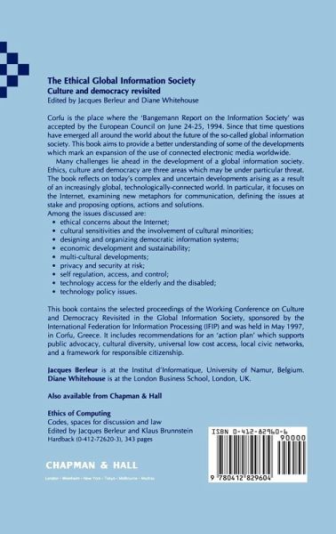 Culture and democracy revisited in the global information society: Summary of a position paper.- Ethics.- A charter for citizens of the global information society.- Information technology and ethics.- Much Ado about Nothing: The Internet Dream.- An analysis of ethical awareness related to computers and information technology of people in the Bangkok metropolis.- Global Information Society.- The global information society: Some reflections on labour and work.- Global digital commerce: Impacts and risks for developments of global information societies.- Going to the future.- Moving towards the millennium: Will information technology take democracy into the 21st century?.- Information assets as a platform for economic growth.- Technology, economic development, and sustainability: The case of Latin America.- Cultural Challenges.- Information society and Greek society: Socio-cultural and political incompatibilities.- Just-in-time open and distant training offers must match market and learners requirements.- What does it mean to be 'virtual'?.- Information technology for persons with a disability: A vision for the International Federation for Information Processing.- Gardening: A metaphor for sustainability in information technology-technical support.- Information society and civil society: Non-governmental organizations and computer-mediated communication in Latin America.- Culture and communication - The interplay in the new public commons: Usenet and community networks.- On cultures and information technology applications in organizations.- The role of Ukrainian universities in the development of the global information society.- Democratic Challenges.- Ethical and social issues of 'teleservices' for disabled and elderly people.- The global information society andthe implications of self-organization.- Information highways: A threat to democracy?.- Privacy at risk in the global information society.- The politics of privacy on the global information highway.- Growing old in an information society.- The Concept of the Agora.- The Internet: A new agora?.- DEMOS: Democratic evaluation of multiple options in society.- Historical and topographical amnesia on the information highway: Metaphors and tacit knowledge.- The role of the Internet both as an ancient agora and a French café for the humanities.- A self-regulated Internet community.- Recommendations.- Recommendations: From sand, through silver, to gold plates.