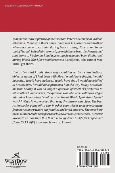 Years later, I saw a picture of the Vietnam Veterans Memorial Wall on television; there was Moe's name. I had met his parents and brother when they came to visit him during basic training. It occurred to me that if I hadn't helped him so much, he might have been discharged and sent home to his family. I had a great uncle who had been discharged during World War I for a similar reason. Lord Jesus, take care of Moe until I get there. It was then that I understood why I could never be a conscientious objector again. If I had been with Moe, I would have fought, I would have hit, I would have stabbed, I would have shot, I would have killed to protect him. I would have protected him the way Bailey protected me from Shorty. It was no longer a question of whether I preferred to kill another human or not; the question was who was I willing to let get injured or killed when I could protect them? Would I just stand by and watch? When it was worded that way, the answer was clear. The best rationale for going off to war in other countries is to keep war away from our country where our families and loved ones are. That was how those soldiers could sacrifice their lives overseas. As Jesus said, "Greater love hath no man than this, that a man lay down his life for his friends" (John 15:13, KJV). How much love do I have?