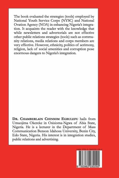 The book evaluated the strategies (tools) employed by National Youth Service Corps (NYSC) and National Orientation Agency (NOA) in enhancing Nigeria's integration. It acquaints the reader with the knowledge that while newsletters and advertorials are not effective other public relations strategies (tools) such as community relations, media relations and corps members are very effective. However, ethnicity, politics of acrimony, religion, lack of social amenities and corruption pose enormous dangers to Nigeria's integration.