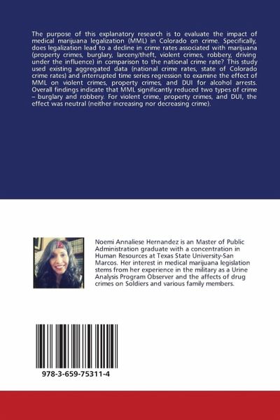 The purpose of this explanatory research is to evaluate the impact of medical marijuana legalization (MML) in Colorado on crime. Specifically, does legalization lead to a decline in crime rates associated with marijuana (property crimes, burglary, larceny/theft, violent crimes, robbery, driving under the influence) in comparison to the national crime rate? This study used existing aggregated data (national crime rates, state of Colorado crime rates) and interrupted time series regression to examine the effect of MML on violent crimes, property crimes, and DUI for alcohol arrests. Overall findings indicate that MML significantly reduced two types of crime - burglary and robbery. For violent crime, property crimes, and DUI, the effect was neutral (neither increasing nor decreasing crime).