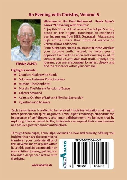 Welcome to the Final Volume of Dr. Frank Alper's Series: "An Evening with Christos" Enjoy this fifth and final book of Dr. Frank Alper's series, based on the original transcripts of channeled evening sessions from 1983. Once again, Masters and high entities share their profound wisdom on universal laws and truths. Dr. Alper does not ask you to accept these words as your absolute truth. Instead, he invites you to approach them with an open and searching mind, to consider and discern your own truth. Through this journey, you are encouraged to reflect deeply and find the resonance within your own soul. Highlights Include: Creation: Healing with Hands Solomon: Universal Consciousness Michael: The Shepherds Murvin: The Primary Function of Space Ashtar Command Adamis: Children of Light and Physical Expression Each transmission is crafted to be received in spiritual vibrations, aiming to foster personal and spiritual growth. Dr. Alper's teachings emphasize the importance of self-discovery and inner enlightenment. He believes that by exploring these universal truths, individuals can expand their consciousness and achieve greater harmony in their lives. Through these pages, Dr. Alper extends his love and humility, offering you insights that have the potential to transform your understanding of the universe and your place within it. Let this book be a companion on your spiritual journey, guiding you towards a deeper connection with the divine.