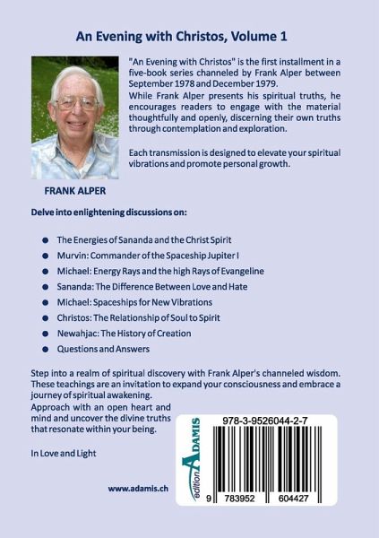This is the first volume of a five-book series titled "An Evening with Christos," channeled by Rev. Dr. Frank Alper from September 1978 to December 1979. Within these pages, Dr. Alper shares his spiritual truths, yet he does not ask readers to accept them as their own. Instead, he invites you to approach his words with an open mind and a searching heart, allowing you to discern your own truths. The transmissions in this book are crafted to resonate on a spiritual level, fostering growth and enlightenment. Explore a variety of profound topics, including: The Energies of Sananda and the Christ Spirit Murvin: Commander of the Spaceship Jupiter I Michael: Energy Rays and the Higher Rays of Evangeline Sananda: The Difference Between Love and Hate Michael: Spaceships for New Vibrations Christos: The Relationship of Soul to Spirit Questions and Answers Embark on a transformative journey with Rev. Dr. Frank Alper's channeled messages. Let the spiritual vibrations within guide you to new heights of understanding and personal growth. Open your mind, explore the depths of your soul, and discover the truth that lies within.