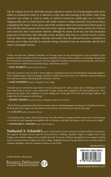 Like the religious service for which this romantic collection is named, An Evensong employs poetic forms within an ecclesiastical context as it endeavors to order and make meaning of our broken world. Using characters and settings as varied as monks in medieval monasteries, middle-aged sons in suburban shopping malls, poets in funeral parlors, and combat veterans in college classrooms, these poems form a congregation that longs to receive grace, and yet this revelation often seems beyond mere human grasp. To assist with this mystical pursuit, the verses turn to the scriptures, mythology, history, and the arts to discern some truth from these transcendent traditions. Although the poems do not shy away from humanity's propensity for destruction, their inherently creative discipline leads them on a journey toward a creative God, one whom they might glimpse with hope and wonder. Thus, the collection becomes a meditation on devotion and worship, much like its namesake's liturgy, interested in how our relationship with the Word creates a meaningful existence.