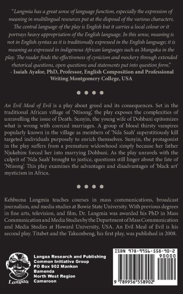 An Evil Meal of Evil is a play about greed and its consequences. Set in the traditional African village of 'Ntisong', the play exposes the complexities of unravelling the issue of Death. Sunyin, the young wife of Dohbani epitomizes what is wrong with coerced marriages. A group of blood thirsty vampires popularly known in the village as members of 'Nda Saah' superstitiously kill targeted individuals purposely to enrich themselves. Sunyin, the protagonist in the play suffers from a premature widowhood simply because her father Njukebim forced her into marrying Dohbani. As the play unravels with the culprit of 'Nda Saah' brought to justice, questions still linger about the fate of 'Ntisong'. This play examines the advantages and disadvantages of 'black art' mysticism in Africa.