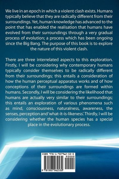 What is the relationship between humans and their surroundings? In order to understand the nature of this relationship we need to take the evolutionary perspective; we need to see the universe as an evolving entity which for billions of years has been very gradually been bringing forth new arrangements, and we need to appreciate that humans are some of these arrangements. The author claims that we live in an epoch in which a violent clash exists. The interactions between humans and their surroundings typically lead to the belief that humans are radically different from their surroundings. Yet, human knowledge has advanced to the point which has revealed the evolutionary perspective. The belief that humans are radically different from their surroundings violently clashes with the belief that the entire universe is an evolving entity which very gradually brings forth new arrangements. The author explores three interrelated aspects of the relationship between humans and their surroundings. Firstly, he seeks to understand why the violent clash exists: Why do contemporary humans typically consider themselves to be radically different from their surroundings? This exploration entails a consideration of how the human perceptual apparatus works, why human perceptions are inevitably constrained, and how conceptions of their surroundings are formed within humans. Secondly, he considers the likelihood that humans could actually be very similar to their surroundings; this entails an exploration of various phenomena such as mind, consciousness, naturalness, awareness, the senses, perception and 'what-it-is-likeness'. Thirdly, he considers whether the human species has a special place in the evolutionary process. This book takes the reader on quite a journey, covering issues such as the limits of our knowledge concerning evolution, the problem of consciousness, directionality in evolution, the location of pain, the purpose of life, how many senses a typical human has, the nature of perception, environmental science, the phantom limb phenomenon, the cosmic significance of technology, planetary astrobiology, the philosophy of biology, human uniqueness, the question of what it means to be human, the nature of the universe, the question of what a mind is, panwhat-it-is-likeness, global warming, the nature of awareness, and the need for planetary geoengineering.
