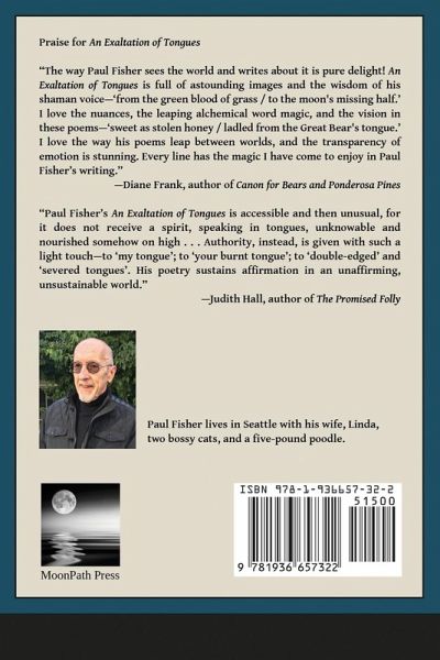"The way Paul Fisher sees the world and writes about it is pure delight! An Exaltation of Tongues is full of astounding images and the wisdom of his shaman voice – ‘from the green blood of grass / to the moon's missing half.’ I love the nuances, the leaping alchemical word magic, and the vision in these poems – ‘sweet as stolen honey / ladled from the Great Bear's tongue.’ I love the way his poems leap between worlds, and the transparency of emotion is stunning. Every line has the magic I have come to enjoy in Paul Fisher’s writing." ~ Diane Frank, Author of Canon for Bears and Ponderosa Pines "Paul Fisher’s An Exaltation of Tongues is accessible and then unusual, for it does not receive a spirit, speaking in tongues, unknowable and nourished somehow on high . . . Authority, instead, is given with such a light touch – to ‘my tongue’; to ‘your burnt tongue’; to ‘double-edged" and ‘severed tongues’. His poetry sustains affirmation in an unaffirming, unsustainable world." ~ Judith Hall, author of The Promised Folly