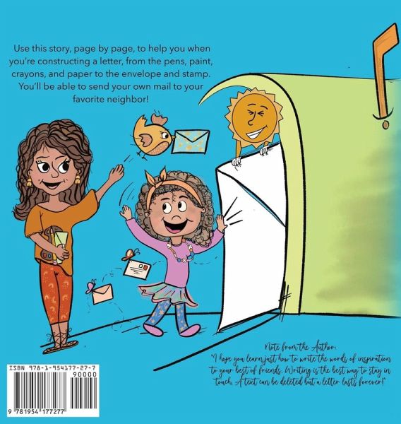 Use this story, page by page, to help you when you're constructing a letter; from the pens, paint, crayons, and paper to the envelope and stamp. You'll be able to send your own mail to your favorite neighbor! Note from the Author: "I hope you learn just how to write the words of inspiration to your best of friends. Writing is the best way to stay in touch. A text can be deleted, but a letter lasts forever!"