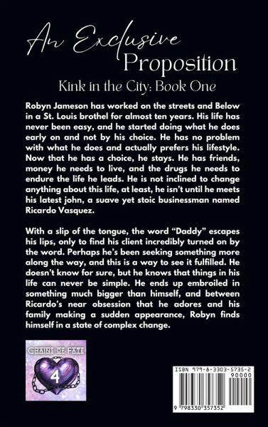 ¿Robyn Jameson has worked on the streets and Below in a St. Louis brothel for almost ten years. His life has never been easy, and he started doing what he does early on and not by his choice. He has no problem with what he does and actually prefers his lifestyle. Now that he has a choice, he stays. He has friends, money he needs to live, and the drugs he needs to endure the life he leads. He is not inclined to change anything about this life, at least, he isn't until he meets his latest john, a suave yet stoic businessman named Ricardo Vasquez.¿With a slip of the tongue, the word "Daddy" escapes his lips, only to find his client incredibly turned on by the word. Perhaps he's been seeking something more along the way, and this is a way to see it fulfilled. He doesn't know for sure, but he knows that things in his life can never be simple. He ends up embroiled in something much bigger than himself, and between Ricardo's near obsession that he adores and his family making a sudden appearance, Robyn finds himself in a state of complex change.