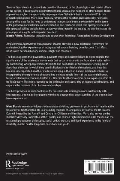 An Existential Approach to Interpersonal Trauma provides a new existential framework for understanding the experiences of interpersonal trauma building on reflections from Marc Boaz's own personal history, clinical insight and research.