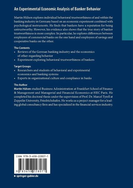 Martin Hülsen explores individual behavioral trustworthiness of and within the banking industry in Germany based on an economic experiment combined with psychological instruments. He finds that bankers have a reputation for being untrustworthy. However, his evidence also shows that the true story of banker trustworthiness is more complex: In particular, he explores differences between employees of commercial banks on the one hand and employees of savings and cooperative banks on the other.