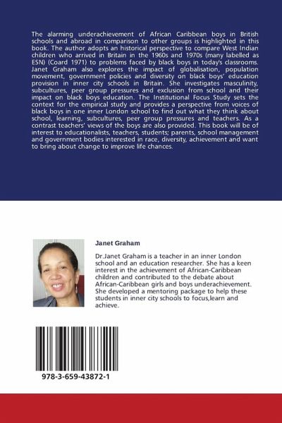 The alarming underachievement of African Caribbean boys in British schools and abroad in comparison to other groups is highlighted in this book. The author adopts an historical perspective to compare West Indian children who arrived in Britain in the 1960s and 1970s (many labelled as ESN) (Coard 1971) to problems faced by black boys in today's classrooms. Janet Graham also explores the impact of globalisation, population movement, government policies and diversity on black boys education provision in inner city schools in Britain. She investigates masculinity, subcultures, peer group pressures and exclusion from school and their impact on black boys education. The Institutional Focus Study sets the context for the empirical study and provides a perspective from voices of black boys in one inner London school to find out what they think about school, learning, subcultures, peer group pressures and teachers. As a contrast teachers views of the boys are also provided. This book willbe of interest to educationalists, teachers, students; parents, school management and government bodies interested in race, diversity, achievement and want to bring about change to improve life chances.