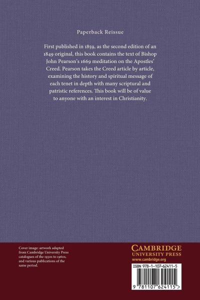 First published in 1859, as the second edition of an 1849 original, this book contains the text of Bishop John Pearson's 1669 meditation on the Apostles' Creed. Pearson takes the Creed article by article, examining the history and spiritual message of each tenet in depth with many scriptural and patristic references. This book will be of value to anyone with an interest in Christianity.