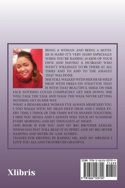 BEING A WOMAN AND BEING A MOTHER IS HARD IT'S VERY HARD ESPECIALLY WHEN YOU'RE RAISING 10 KIDS OF YOUR OWN AND HAVING A HUSBAND WHO WASN'T WILLINGLY TO BE THERE AT ALL TIMES AND TO ADD TO THE ASSAULT THAT WAS DONE. SHE STILL WALKED WITH HER HEAD HELD HIGH WITH HEELS ON STILETTOS THAT IS WITH THAT BEAUTIFUL SMILE ON HER FACE NOTHING COULD COMPLETELY GET HER DOWN. SHE WILL TALK THE TALK AND WALK THE WALK NEVER LETTING NOTHING GET IN HER WAY. WHAT A REMARKABLE WOMAN I'VE ALWAYS MIMICKED YOU. I TOO WALKS WITH MY HEAD HELD HIGH AND I SMILE EVERY TIME, I THINK OF THE TIMES WE'VE SHARED TOGETHER, I MISS YOU MOMA AND I ALWAYS WILL YOUR MY SUNSHINE EVERY MORNING AND MY THOUGHTS AT NIGHT. THIS BOOK IS FOR YOU AND MY BIG BROTHER SAMUEL WHOM HAS PAST WILL READ IT IN SPIRIT. AND MY BIG SISTER RAMONA AND SISTER- IN- LAW AUDREY. THANKS FOR HELPING IN RAISING ME, AND MY SIBLINGS I LOVE YOU ALL AND I'M FOREVER GRATEFUL.