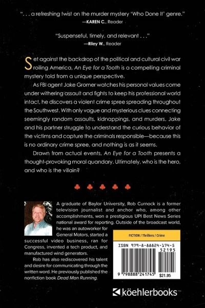 Set against the backdrop of the political and cultural civil war roiling America, An Eye for a Tooth is a compelling criminal mystery told from a unique perspective. As FBI agent Jake Gromer watches his personal values come under withering assault and fights to keep his professional world intact, he discovers a violent crime spree spreading throughout the Southwest. With only vague and mysterious clues connecting seemingly random assaults, kidnappings, and murders, Jake and his partner struggle to understand the curious behavior of the victims and capture the criminals responsible-because this is no ordinary crime spree, and nothing is as it seems. Drawn from actual events, An Eye for a Tooth presents a thought-provoking moral quandary. Ultimately, who is the hero, and who is the villain?