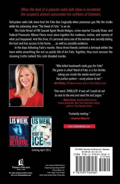 When the host of a popular radio talk show is murdered, the suspects almost outnumber his millions of listeners. Outspoken radio talk show host Jim Fate dies tragically when poisonous gas fills the studio while his polarizing show, "The Hand of Fate," is on air. The triple threat of FBI Special Agent Nicole Hedges, crime reporter Cassidy Shaw, and Federal Prosecutor Allison Pierce must piece together the madness, motive, and mystery of what just happened. And this time it's personal since one of the women was secretly dating the host and has access to his home...and secret evidence. In the days following Fate's murder, these three friends must confront a betrayal within the team while unearthing the not-so-public life of Jim Fate. Together, they must uncover the stunning truths behind this cold-blooded murder.