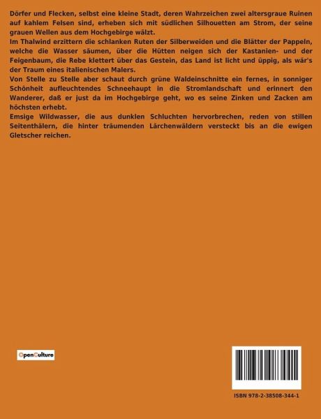 Dörfer und Flecken, selbst eine kleine Stadt, deren Wahrzeichen zwei altersgraue Ruinen auf kahlem Felsen sind, erheben sich mit südlichen Silhouetten am Strom, der seine grauen Wellen aus dem Hochgebirge wälzt. Im Thalwind erzittern die schlanken Ruten der Silberweiden und die Blätter der Pappeln, welche die Wasser säumen, über die Hütten neigen sich der Kastanien- und der Feigenbaum, die Rebe klettert über das Gestein, das Land ist licht und üppig, als wär's der Traum eines italienischen Malers. Von Stelle zu Stelle aber schaut durch grüne Waldeinschnitte ein fernes, in sonniger Schönheit aufleuchtendes Schneehaupt in die Stromlandschaft und erinnert den Wanderer, daß er just da im Hochgebirge geht, wo es seine Zinken und Zacken am höchsten erhebt. Emsige Wildwasser, die aus dunklen Schluchten hervorbrechen, reden von stillen Seitenthälern, die hinter träumenden Lärchenwäldern versteckt bis an die ewigen Gletscher reichen.