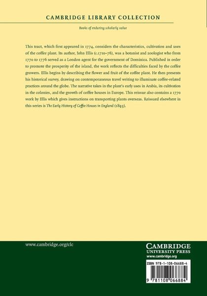 This tract, which first appeared in 1774, considers the characteristics, cultivation and uses of the coffee plant. Its author, John Ellis (c.1710-76), was a botanist and zoologist who from 1770 to 1776 served as a London agent for the government of Dominica. Published in order to promote the prosperity of the island, the work reflects the difficulties faced by the coffee growers. Ellis begins by describing the flower and fruit of the coffee plant. He then presents his historical survey, drawing on contemporaneous travel writing to illuminate coffee-related practices around the globe. The narrative takes in the plant's early uses in Arabia, its cultivation in the colonies, and the growth of coffee houses in Europe. This reissue also contains a 1770 work by Ellis which gives instructions on transporting plants overseas. Reissued elsewhere in this series is The Early History of Coffee Houses in England (1893).