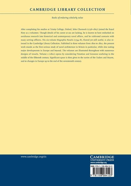 After completing his studies at Trinity College, Oxford, John Charnock (1756-1807) joined the Royal Navy as a volunteer. Though details of his career at sea are lacking, he is known to have embarked on assiduous research into historical and contemporary naval affairs, and he cultivated contacts with many serving officers. His six-volume Biographia Navalis (1794-8), flawed yet still useful, is also reissued in the Cambridge Library Collection. Published in three volumes from 1800 to 1802, the present work stands as the first serious study of naval architecture in Britain in particular, while also noting major developments in Europe and beyond. The volumes are illustrated throughout with numerous designs of vessels. Volume 2 (1801) opens by considering Venetian and Genoese seafaring in the middle of the fifteenth century. Significant space is then given to the navies of the Tudors and Stuarts, and to changes in Europe up to the end of the seventeenth century.