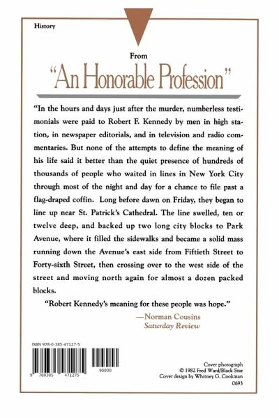 To commemorate the 25th anniversary of the assassination of RFK, Doubleday/Main Street Books reissues a collection of articles and photos from the time immediately after the event. Part of the proceeds goes to the Robert F. Kennedy Memorial Fund, which rewards individuals who have accomplished themselves in the area of human rights. Authorized by the Kennedy family.