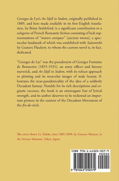 Georges de Lys's An Idyll in Sodom, originally published in 1889, and here made available in its first English translation, by Brian Stableford, is a significant contribution to a subgenre of French Romantic fiction consisting of lush representations of "moeurs antiques" [ancient mores], a spectacular landmark of which was established with Salammbô by Gustave Flaubert, to whom the current novel is, in fact, dedicated. "Georges de Lys" was the pseudonym of Georges Fontaine de Bonnerive (1855-1931), an army officer and literary maverick, and An Idyll in Sodom, with its robust approach to plotting and its muscular images of male beauty, illustrates the near-paradoxicality of the idea of a soldierly Decadent fantasy. Notable for its rich descriptions and orgiastic excesses, the book is an extravagant feat of lyrical strength, and its author deserves to be reckoned an important pioneer in the context of the Decadent Movement of the fin-de-siècle.