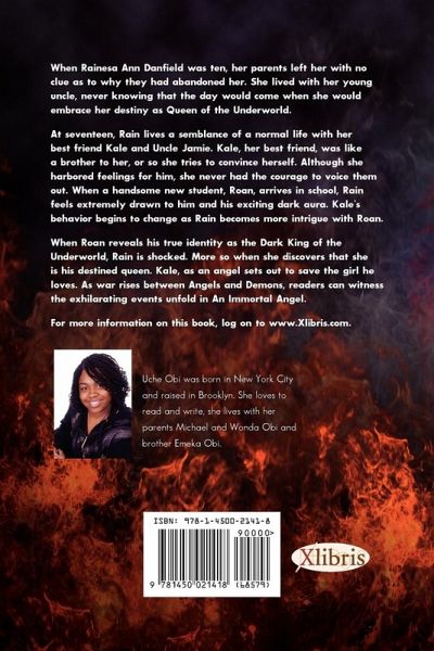 When Rainesa Ann Danfield was ten, her parents left her with no clue as to why they had abandoned her. She lived with her young uncle, never knowing that the day would come when she would embrace her destiny as Queen of the Underworld. At seventeen, Rain lives a semblance of a normal life with her best friend Kale and Uncle Jamie. Kale, her best friend, was like a brother to her, or so she tries to convince herself. Although she harbored feelings for him, she never had the courage to voice them out. When a handsome new student, Roan, arrives in school, Rain feels extremely drawn to him and his exciting dark aura. Kale's behavior begins to change as Rain becomes more intrigue with Roan. When Roan reveals his true identity as the Dark King of the Underworld, Rain is shocked. More so when she discovers that she is his destined queen. Kale, as an angel sets out to save the girl he loves. As war rises between Angels and Demons, readers can witness the exhilarating events unfold in An Immortal Angel.