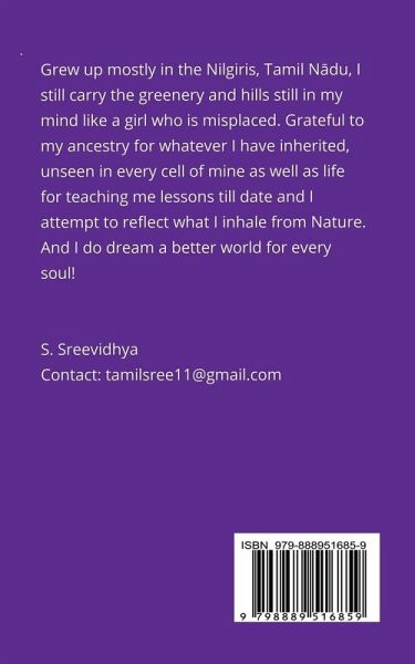 Grew up mostly in the Nilgiris, Tamil N¿du, India, I still carry the greenery and hills still in my mind like a girl who is misplaced. Grateful to my ancestry for whatever I have inherited, unseen in every cell of mine as well as life for teaching me lessons till date and I attempt to reflect what I inhale from Nature through my poems. And I do dream a better world for every soul! S. Sreevidhya Contact: tamilsree11@gmail.com