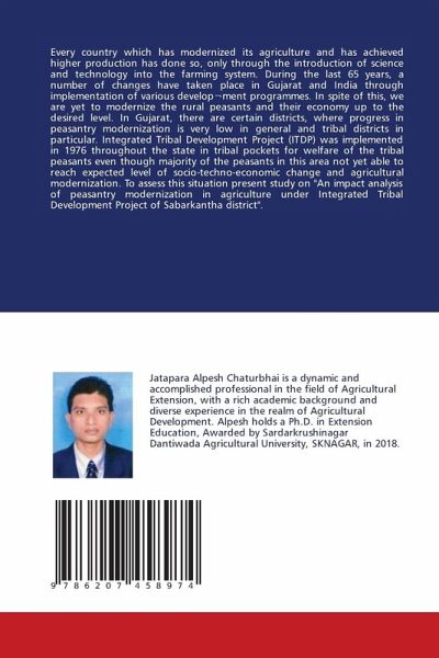 Every country which has modernized its agriculture and has achieved higher production has done so, only through the introduction of science and technology into the farming system. During the last 65 years, a number of changes have taken place in Gujarat and India through implementation of various develop¬ment programmes. In spite of this, we are yet to modernize the rural peasants and their economy up to the desired level. In Gujarat, there are certain districts, where progress in peasantry modernization is very low in general and tribal districts in particular. Integrated Tribal Development Project (ITDP) was implemented in 1976 throughout the state in tribal pockets for welfare of the tribal peasants even though majority of the peasants in this area not yet able to reach expected level of socio-techno-economic change and agricultural modernization. To assess this situation present study on "An impact analysis of peasantry modernization in agriculture under Integrated Tribal Development Project of Sabarkantha district".