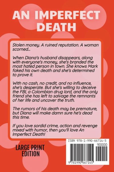 Stolen money. A ruined reputation. A woman scorned... When Diana's husband disappears – along with everyone's money – she's branded the most hated person in town. She knows Mark faked his own death and she's determined to prove it. With no cash, no credit, and no influence, she's desperate. But she's willing to deceive the FBI, a Colombian drug lord, and the only friend she has left to salvage the remnants of her life and uncover the truth. The rumors of his death may be premature, but Diana will make damn sure he's dead this time. If you love sordid crime, action and revenge mixed with humor, then you'll love An Imperfect Death!