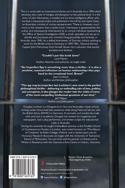 This is a novel with an international theme set in Australia circa 1996 which develops into a tale of intrigue and deception at the political level. It is the story of John Hennessey, a novelist and ex-army intelligence officer who has had a manuscript stolen and published in the UK by one Gavin Dean, an Australian criminal of vicious temperament. There is, however, much more to the situation than a stolen book. Hennessey is questioned by the police, and subsequently interviewed by an urbane individual representing the Office of Special Investigation (OSI), a small, specialist unit set up to identify and prosecute war criminals living peacefully, but furtively, in Australia since 1945. As a skilled interviewer of German civilians wishing to work for the British army in Germany in 1959-1961, National Service Captain John Hennessey finds himself drawn into a situation that quickly escalates and darkens. "Couldn't put this book down" Lynn Martin Author, historian and authority on single malts "An Imperfect Spy is something more than a thriller - it is also a sensitive, nuanced reflection on human relationships that pays heed to the emotional level. Bravo!" Jean Curthoys Author and feminist philosopher. "The spy may be imperfect but Lockhart's new novel is the perfect philosophical thriller - delivering an enthralling tale of love, politics, and corruption, it also plunges the reader into the midst of some of the most compelling intellectual questions of our time" Jeff Malpas Author and philosopher