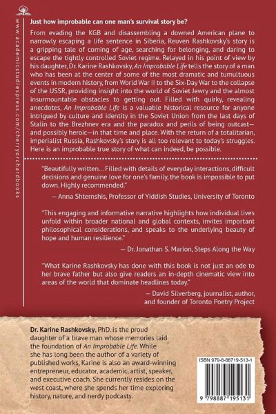 An Improbable Life recounts Rashkovsky's father's childhood as a Jew in the post-World War II Soviet Union facing totalitarian oppression, deep poverty, petty harassment, discrimination, service in the Red Army during the Six-Day War in 1967, and his extraordinary escape to Israel in 1972. With the return of a totalitarian, imperialist Russia and the disturbing rise in antisemitism, Rashkovsky's story is all too relevant to today's struggles. Here is an impossible true story of what can be, indeed, possible.