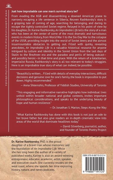 An Improbable Life recounts Rashkovsky's father's childhood as a Jew in the post-World War II Soviet Union facing totalitarian oppression, deep poverty, petty harassment, discrimination, service in the Red Army during the Six-Day War in 1967, and his extraordinary escape to Israel in 1972. With the return of a totalitarian, imperialist Russia and the disturbing rise in antisemitism, Rashkovsky's story is all too relevant to today's struggles. Here is an impossible true story of what can be, indeed, possible.