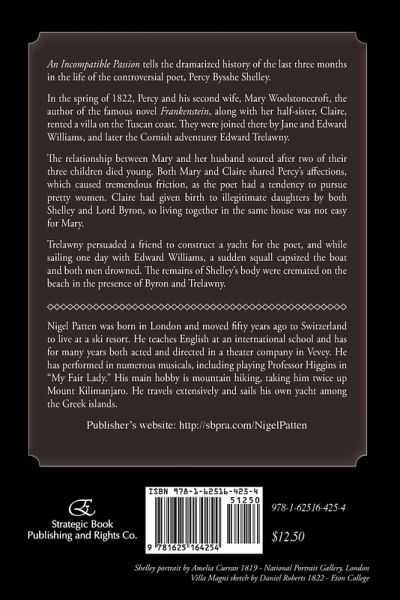 An Incompatible Passion tells the dramatized history of the last three months in the life of the controversial poet, Percy Bysshe Shelley. In the spring of 1822, Percy and his second wife, Mary Woolstonecroft, the author of the famous novel Frankenstein, along with her half-sister, Claire, rented a villa on the Tuscan coast. They were joined there by Jane and Edward Williams, and later the Cornish adventurer Edward Trelawny.The relationship between Mary and her husband soured after two of their three children died young. Both Mary and Claire shared Percy's affections, which caused tremendous friction, as the poet had a tendency to pursue pretty women. Claire had given birth to illegitimate daughters by both Shelley and Lord Byron, so living together in the same house was not easy for Mary.Trelawny persuaded a friend to construct a yacht for the poet, and while sailing one day with Edward Williams, a sudden squall capsized the boat and both men drowned. The remains of Shelley's body were cremated on the beach in the presence of Byron and Trelawny.Nigel Patten was born in London and moved fifty years ago to Switzerland to live at a ski resort. He teaches English at an international school and has for many years both acted and directed in a theater company in Vevey. He has performed in numerous musicals, including playing Professor Higgins in "My Fair Lady." His main hobby is mountain hiking, taking him twice up Mount Kilimanjaro. He travels extensively and sails his own yacht among the Greek islands.