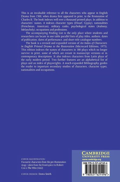 This is an invaluable reference to all the characters who appear in English drama from 1500 to 1660. The book indexes well over a thousand printed plays. In addition to characters' names it indexes character types (Dwarf, Gypsy), nationalities (Frenchman, American), military ranks, psychological states (Jealousy, Melancholy), occupations and professions. The accompanying Finding List provides a table of play titles, authors, dates of publication, dates of performance and short-title catalogue numbers. The book is a much revised and expanded version of An Index of Characters in English Printed Drama to the Restoration (1975). This edition indexes the names of characters in 180 plays which no longer survive in print and characters from Latin plays of the period. Further features are an alphabetical list of plays, an index of playwrights and an expanded bibliography.