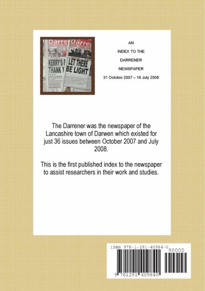 This is the first published index to The Darrener newspaper, the short-lived newspaper for the Lancashire town of Darwen.
