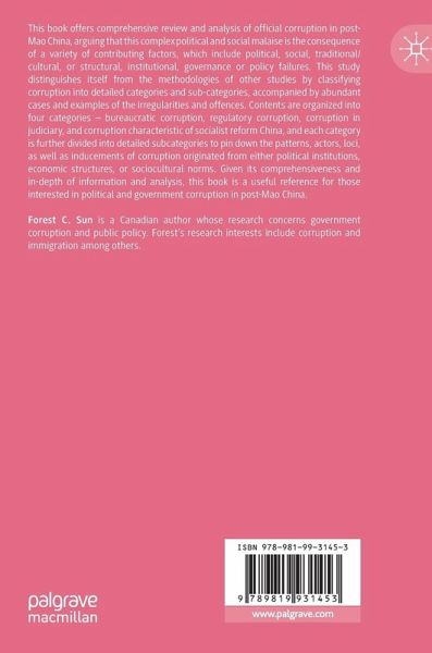 This book offers comprehensive review and analysis of official corruption in post-Mao China, arguing that this complex political and social malaise is the consequence of a variety of contributing factors, which include political, social, traditional/cultural, or structural, institutional, governance or policy failures. This study distinguishes itself from the methodologies of other studies by classifying corruption into detailed categories and sub-categories, accompanied by abundant cases and examples of the irregularities and offences. Contents are organized into four categories - bureaucratic corruption, regulatory corruption, corruption in judiciary, and corruption characteristic of socialist reform China, and each category is further divided into detailed subcategories to pin down the patterns, actors, loci, as well as inducements of corruption originated from either political institutions, economic structures, or sociocultural norms. Given its comprehensiveness and in-depth ofinformation and analysis, this book is a useful reference for those interested in political and government corruption in post-Mao China.