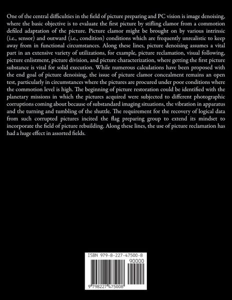 One of the central difficulties in the field of picture preparing and PC vision is image denoising, where the basic objective is to evaluate the first picture by stifling clamor from a commotion defiled adaptation of the picture. Picture clamor might be brought on by various intrinsic (i.e., sensor) and outward (i.e., condition) conditions which are frequently unrealistic to keep away from in functional circumstances. Along these lines, picture denoising assumes a vital part in an extensive variety of utilizations, for example, picture reclamation, visual following, picture enlistment, picture division, and picture characterization, where getting the first picture substance is vital for solid execution. While numerous calculations have been proposed with the end goal of picture denoising, the issue of picture clamor concealment remains an open test, particularly in circumstances where the pictures are procured under poor conditions where the commotion level is high. The beginning of picture restoration could be identified with the planetary missions in which the pictures acquired were subjected to different photographic corruptions coming about because of substandard imaging situations, the vibration in apparatus and the turning and tumbling of the shuttle. The requirement for the recovery of logical data from such corrupted pictures incited the flag preparing group to extend its mindset to incorporate the field of picture rebuilding. Along these lines, the use of picture reclamation has had a huge effect in assorted fields.