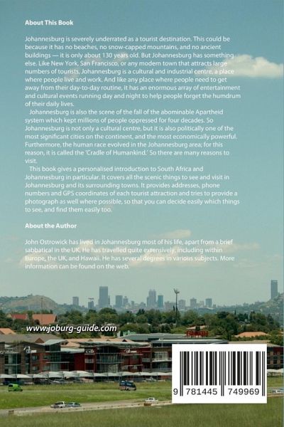 Johannesburg is severely underrated as a tourist destination. This could be because it has no beaches, no snow-capped mountains, and no ancient buildings. But Johannesburg has something else - it is a cultural and industrial centre, with an enormous array of entertainment events running day and night. Johannesburg is also the scene of the fall of the abominable Apartheid system. So Johannesburg is not only a cultural centre, but it is also politically one of the most significant cities in Africa, and the most economically powerful. Furthermore, the human race evolved in the Johannesburg area. So there are many reasons to visit. This book gives an introduction to South Africa and Johannesburg in particular. It covers all the things to see and visit in Johannesburg and its surrounds. It provides addresses, phone numbers and GPS coordinates of each tourist attraction, so that you can find them easily.