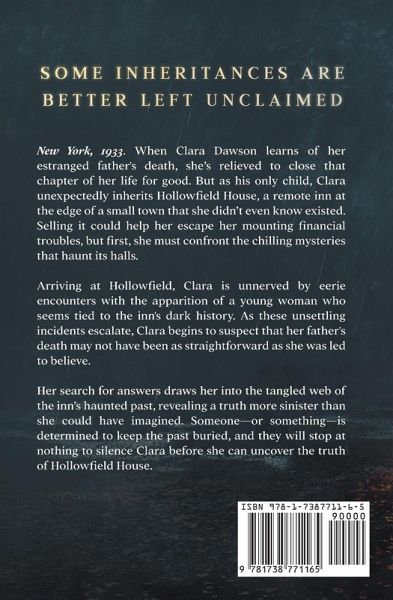 Some secrets refuse to stay buried... Upstate NY, 1933. When Clara Dawson learns of her estranged father's death, she's relieved to close that chapter of her life for good. But as his only child, Clara unexpectedly inherits Hollowfield House, a remote inn at the edge of a small town that she didn't even know existed. Selling it could help her escape her mounting financial troubles, but first, she must confront the chilling mysteries that haunt its halls. Arriving at Hollowfield, Clara is unnerved by eerie encounters that leave her questioning her sanity-a mysterious locket, an unsigned letter, and the apparition of a young woman who seems tied to the inn's dark history. As these unsettling incidents escalate, Clara begins to suspect that her father's death may not have been as straightforward as she was led to believe. Her search for answers draws her into the tangled web of the inn's haunted past, revealing a truth more sinister than she could have imagined. Someone-or something-is determined to keep the past buried, and they will stop at nothing to silence Clara before she uncovers the truth of Hollowfield House. For readers craving a ghost story woven with gothic suspense and a hint of romantic tension, An Insidious Inheritance is a paranormal mystery that will keep you guessing until the last page.