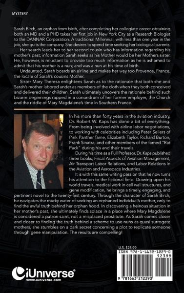 Sarah Birch, an orphan from birth, after completing her collegiate career obtaining both an MD and a PHD takes her first job in New York City as a Research Biologist to the DANNAR Corporation. A traditional Millennial, with less than one year in the job, she quits the company. She desires to spend time seeking her biological parents. Her search leads her to her second cousin who has information regarding his mother's past; information Sarah seeks as his Mother would be her Mothers sister. He, however, is reluctant to provide too much information as he is ashamed to admit that his mother is a nun; and was a nun at his time of birth. Undaunted, Sarah boards an airline and makes her way too Provence, France, the locale of Sarah's cousins Mother. Sister Mary Theresa enlightens Sarah as to the rationale that both she and Sarah's mother labored under as members of the cloth when they both conceived and delivered their children. Sarah ultimately uncovers the rationale behind such bizarre beginnings rapped in a conundrum of her former employer, the Church and the riddle of Mary Magdalene's time in Southern France.