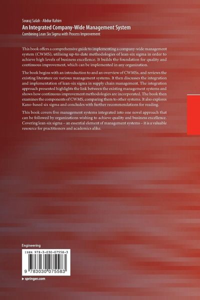 This book offers a comprehensive guide to implementing a company-wide management system (CWMS), utilising up-to-date methodologies of lean-six sigma in order to achieve high levels of business excellence. It builds the foundation for quality and continuous improvement, which can be implemented in any organization. The book begins with an introduction to and an overview of CWMSs, and reviews the existing literature on various management systems. It then discusses the integration and implementation of lean-six sigma in supply chain management. The integration approach presented highlights the link between the existing management systems and shows how continuous improvement methodologies are incorporated. The book then examines the components of CWMS, comparing them to other systems. It also explores Kano-based six sigma and concludes with further recommendations for reading. This book covers five management systems integrated into one novel approach that can be followed by organizations wishing to achieve quality and business excellence. Covering lean-six sigma - an essential element of management systems - it is a valuable resource for practitioners and academics alike.