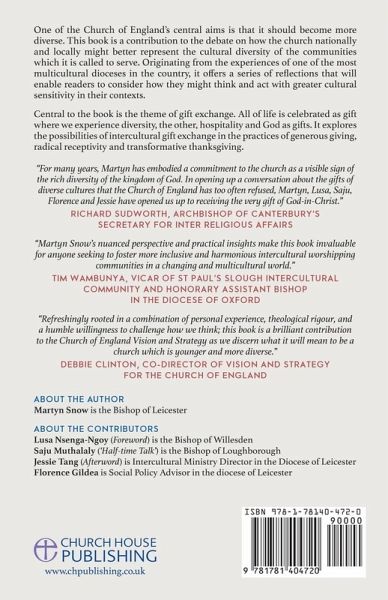 One of the Church of England's central aims is that it should become more diverse. This book is a contribution to the debate on how the church nationally and locally might better represent the cultural diversity of the communities which it is called to serve. Originating from the experiences of one of the most multicultural dioceses in the country, it offers a series of reflections that will enable readers to consider how they might think and act with greater cultural sensitivity in their contexts. Central to the book is the theme of gift exchange. All of life is celebrated as gift where we experience diversity, the other, hospitality and God as gifts. It explores the possibilities of intercultural gift exchange in the practices of generous giving, radical receptivity and transformative thanksgiving.