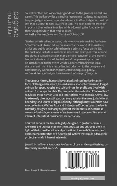 'Rather breath taking in scope, this new scholarly book by Professor Schaffner seeks to introduce the reader to the world of animal law, ethic and public policy. While there is a primary focus on the US, the book also includes a number of issues and examples from around the globe. It is more complex than a simple recitation of the present law, as it also is a critic of the failures of the present system and an introduction to the ethics which support enhancing the legal status animals. It is an excellent introduction to the complex and contradictory world of animal law, ethics and public policy.' - David Favre, Michigan State University College of Law, USA