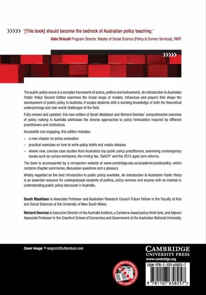 The public policy arena is a complex framework of actors, politics and instruments. An Introduction to Australian Public Policy, Second Edition examines the broad range of models, influences and players that shape the development of public policy in Australia, and equips students with a working knowledge of both the theoretical underpinnings and real-world challenges of the field. Fully revised and updated, the new edition addresses the diverse approaches to policy formulation required by different practitioners and institutions. Accessible and engaging, this edition includes: a new chapter on policy evaluation; practical exercises on how to write policy briefs and media releases and eleven new, concise case studies from Australia's top public policy practitioners. The book is accompanied by a companion website which contains chapter summaries and a glossary. Widely regarded as the best introduction to Australian public policy available, the book is an essential resource for undergraduate students of politics and policy workers.