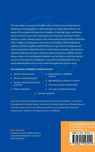 This systematic introduction to Buddhist ethics is aimed at anyone interested in Buddhism, including students, scholars and general readers. Peter Harvey is the author of the acclaimed Introduction to Buddhism (Cambridge, 1990), and his new book is written in a clear style, assuming no prior knowledge. At the same time it develops a careful, probing analysis of the nature and practical dynamics of Buddhist ethics in both its unifying themes and in the particularities of different Buddhist traditions. The book applies Buddhist ethics to a range of issues of contemporary concern: humanity's relationship with the rest of nature; economics; war and peace; euthanasia; abortion; the status of women; and homosexuality. Professor Harvey draws on texts of the main Buddhist traditions, and on historical and contemporary accounts of the behaviour of Buddhists, to describe existing Buddhist ethics, to assess different views within it, and to extend its application into new areas.