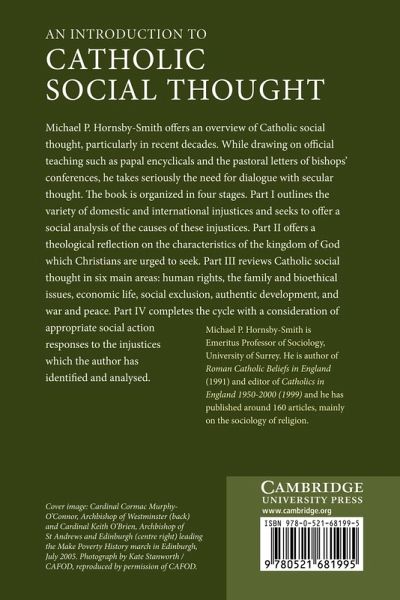 Michael Hornsby-Smith offers an overview of Catholic social thought particularly in recent decades. While drawing on official teaching such as papal encyclicals and the pastoral letters of bishops' conferences, he takes seriously the need for dialogue with secular thought. The book is organized in four stages. Part I outlines the variety of domestic and international injustices and seeks to offer a social analysis of the causes of these injustices. Part II offers a theological reflection on the characteristics of the kingdom of God which Christians are urged to seek. Part III reviews Catholic social thought in six main areas: human rights, the family and bioethical issues, economic life, social exclusion, authentic development, and war and peace. Part IV completes the cycle with a consideration of appropriate social action responses to the injustices which the author has identified and analysed.