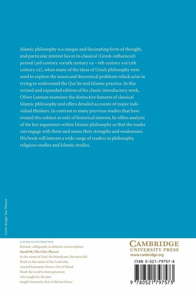 Islamic philosophy is a unique and fascinating form of thought, and particular interest lies in its classical (Greek-influenced) period, when many of the ideas of Greek philosophy were used to explore the issues and theoretical problems which arise intrying to understand the Qur'an and Islamic practice. In this revised and expanded edition of his classic introductory work, Oliver Leaman examines the distinctive features of Classical Islamic philosophy and offers detailed accounts of major individual thinkers. In contrast to many previous studies that have treated this subject as only of historical interest, he offers analysis of the key arguments within Islamic philosophy so that the reader can engage with them and assess their strengths and weaknesses. His book will interest a wide range of readers in philosophy, religious studies and Islamic studies.