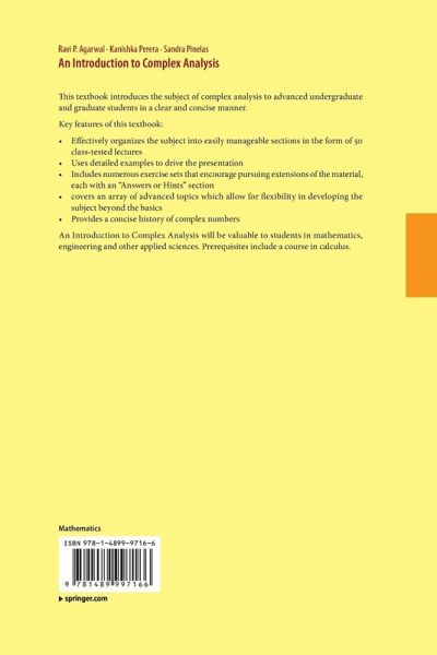 From the reviews: "This work, directed toward majors in the applied sciences, is presented as a series of 50 lectures on standard topics in introductory complex analysis. Agarwal and Perera (both, Florida Institute of Technology) and Pinelas (Azores Univ., Portugal) have organized each lecture/chapter around certain theorems and their proofs and accompany each with a problem set and solutions. ... Summing Up: Recommended. Upper-division undergraduates and graduate students." (D. Robbins, Choice, Vol. 49 (5), January, 2012) "This volume provides a compact and thorough introduction to complex analysis. The text takes account of varying needs and backgrounds and provides a self-study text for students in mathematics, science and engineering. ... This concise text not only provides efficient proofs but also shows students how to derive them. The excellent exercises are accompanied by selected solutions. ... The exposition is clear, concise, and lively. The book is mainly addressed to undergraduate and graduate students interested in complex analysis." (Teodora-Liliana Radulescu, Zentralblatt MATH, Vol. 1230, 2012) "It consists of 50 'class-tested lectures' in which the subject matter has been organized in the form of theorems, proofs and examples. Most of the lectures are ... followed by graded exercises that go from the routine to the richly informative. Solutions and hints are provided for nearly all of these, which means that the book is highly suited for self-tuition purposes. ... it is also suited to the needs of non-specialists, such as those concerned with the applied sciences." (P. N. Ruane, The Mathematical Association of America, October, 2011)
