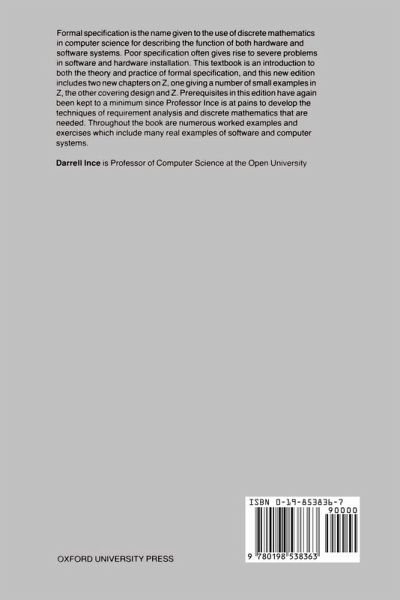 Formal specification is the name given to the use of discrete mathematics in computer science for describing the function of both hardware and software systems. Poor specification often gives rise to severe problems in software and hardware installation. This textbook is an introduction to both the theory and practice of formal specification, and this new edition includes two new chapters on Z, one giving a number of small examples in Z, the other covering design and Z. Prerequisites in this edition have been kept to a minimum since Professor Ince is at pains to develop the techniques of requirement analysis and discrete mathematics that are needed. Throughout the book are numerous worked examples and exercises which include many real examples of software and computer systems.